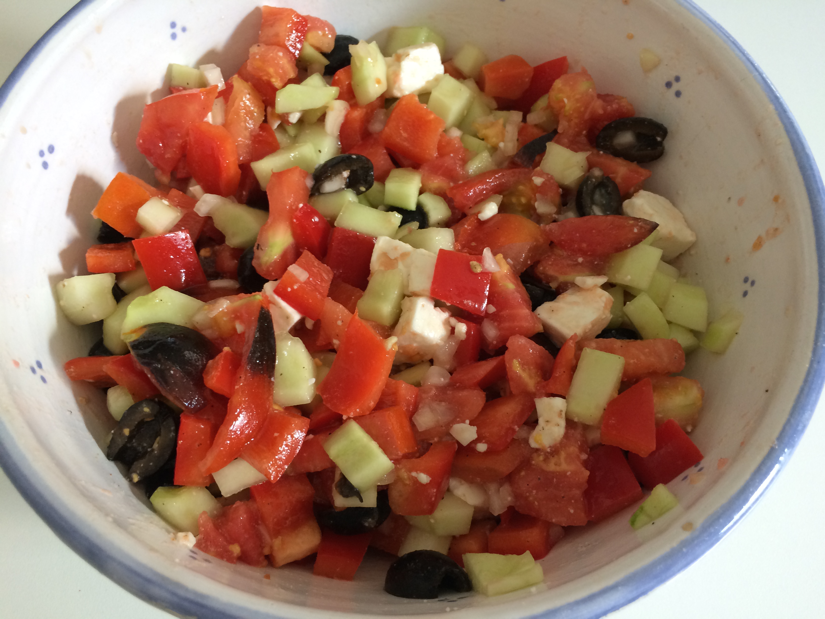 Aus den Gurken, den Tomaten, Ziebeln, gekauften Paprika, schwarzen Oliven und Schafskäse wurde mit Hilfe von Salz, Pfeffer, Knoblauch, Essig und Olivenöl ein Griechischer Bauernsalat.