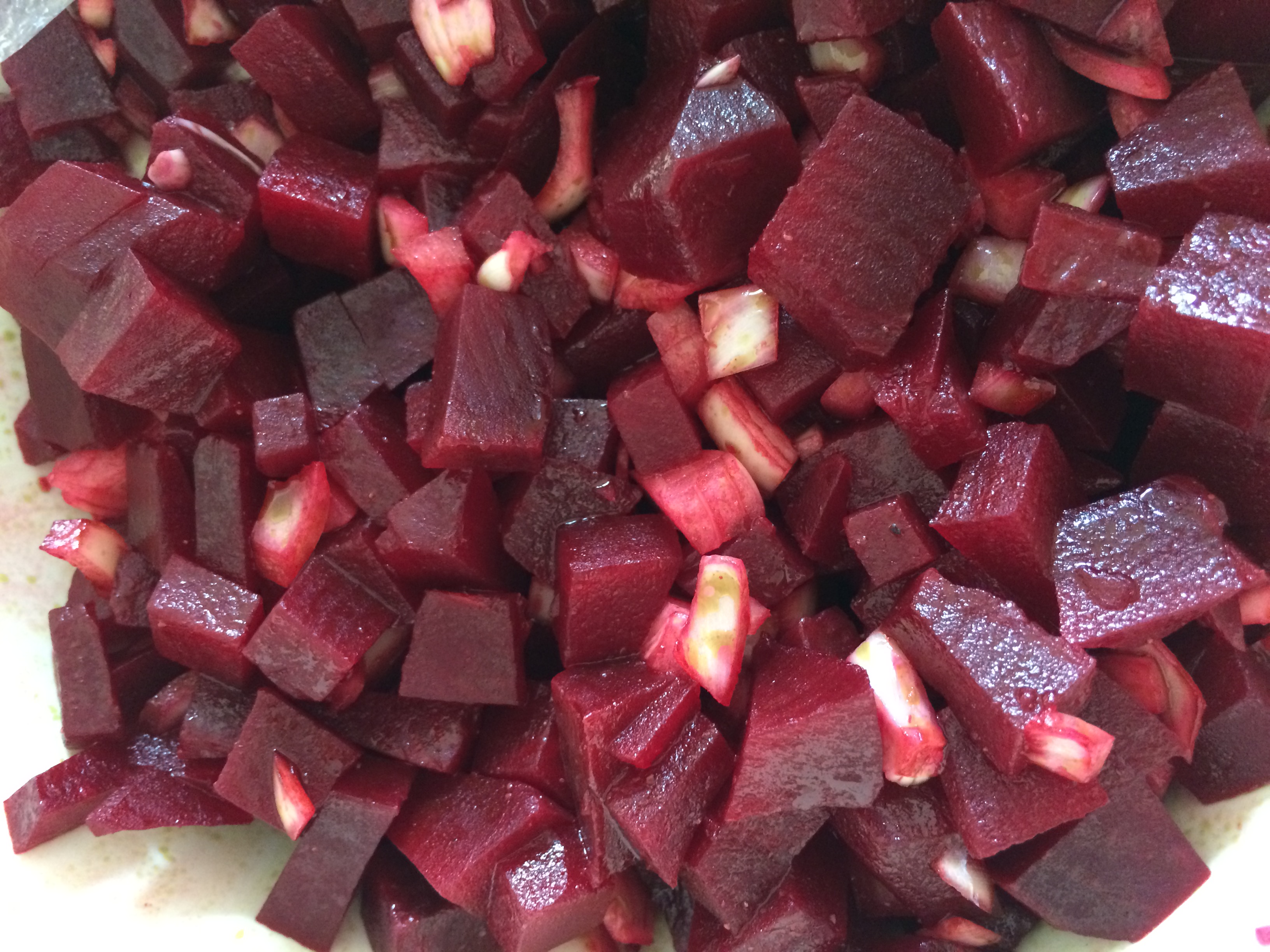Die Rote Bete wurde gekocht, geschält, kleingeschnitten und mit Zwiebeln, Salz, Pfeffer, Essig und Kürbiskernöl angemacht.