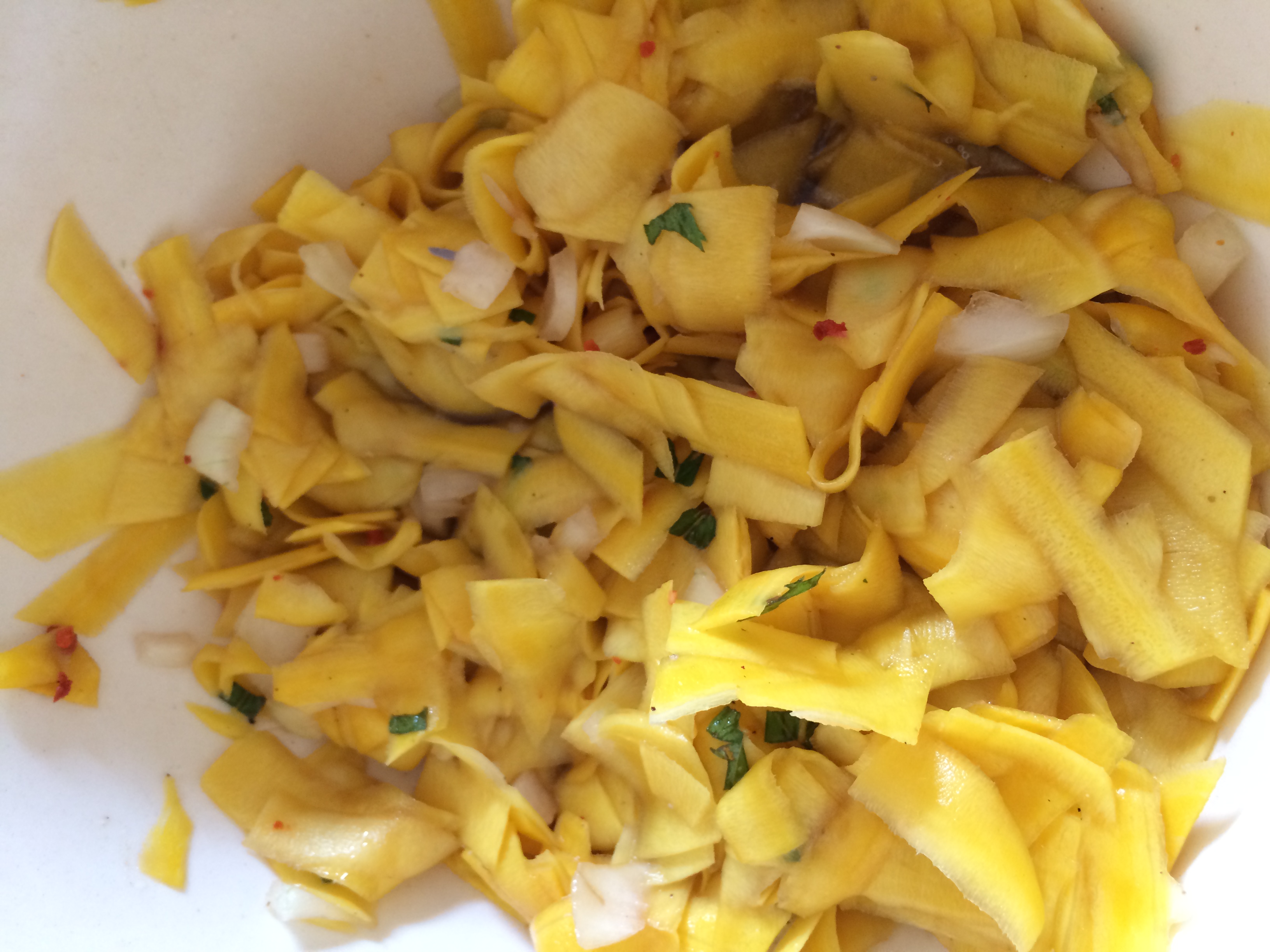Zucchini mit dem Sparschäler in Streifen schälen, nur die obere Schicht ohne Kerne. Dann in kleinere Stücke schneiden. Mit Salz, Pfeffer, Essig, Öl, Chili und kleingeschnittenen Minzblättern anmachen. Das schmeckt echt überraschend gut und da keiner mehr Zucchini damit in Verbindung bringt, wird das bestimmt der Hit!