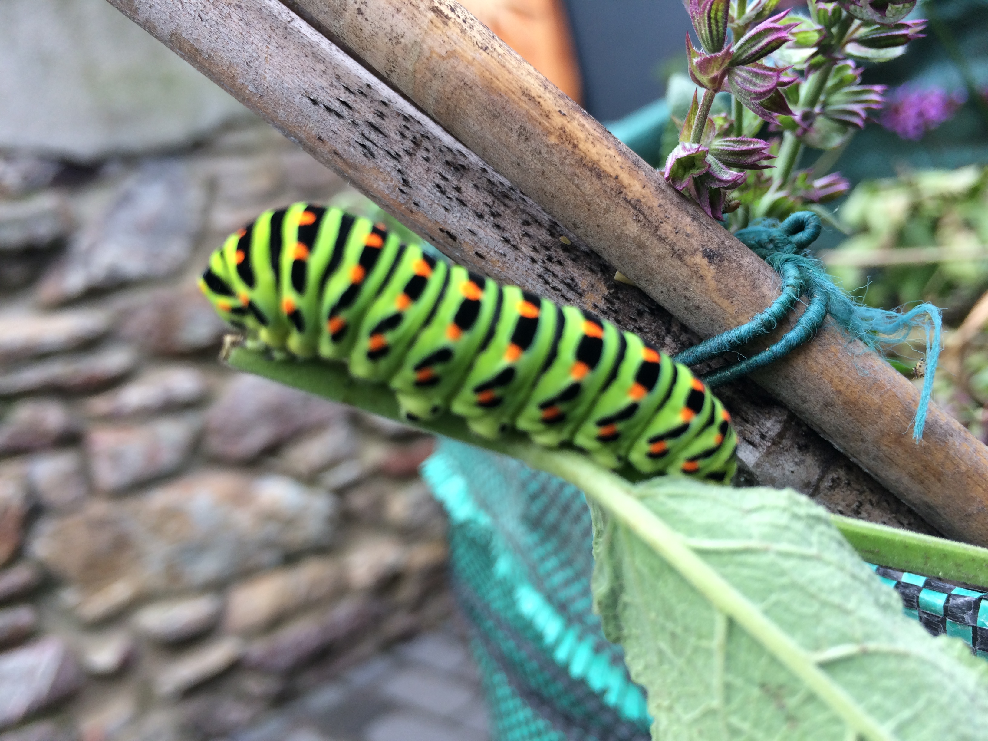 Angefangen hat es damit, dass Jakob auf dem Weg in den Kindergarten auf dem Grünschnitthaufen eine echt grelle Raupe entdeckt hat. Und natürlich direkt bestimmt hat, dass diese bei uns bleiben muss. Erstaunlicher Weise war es überhaupt kein Problem herauszufinden, dass es sich um eine Schwalbenschwanz-Raupe handelt – Internet ist echt praktisch.