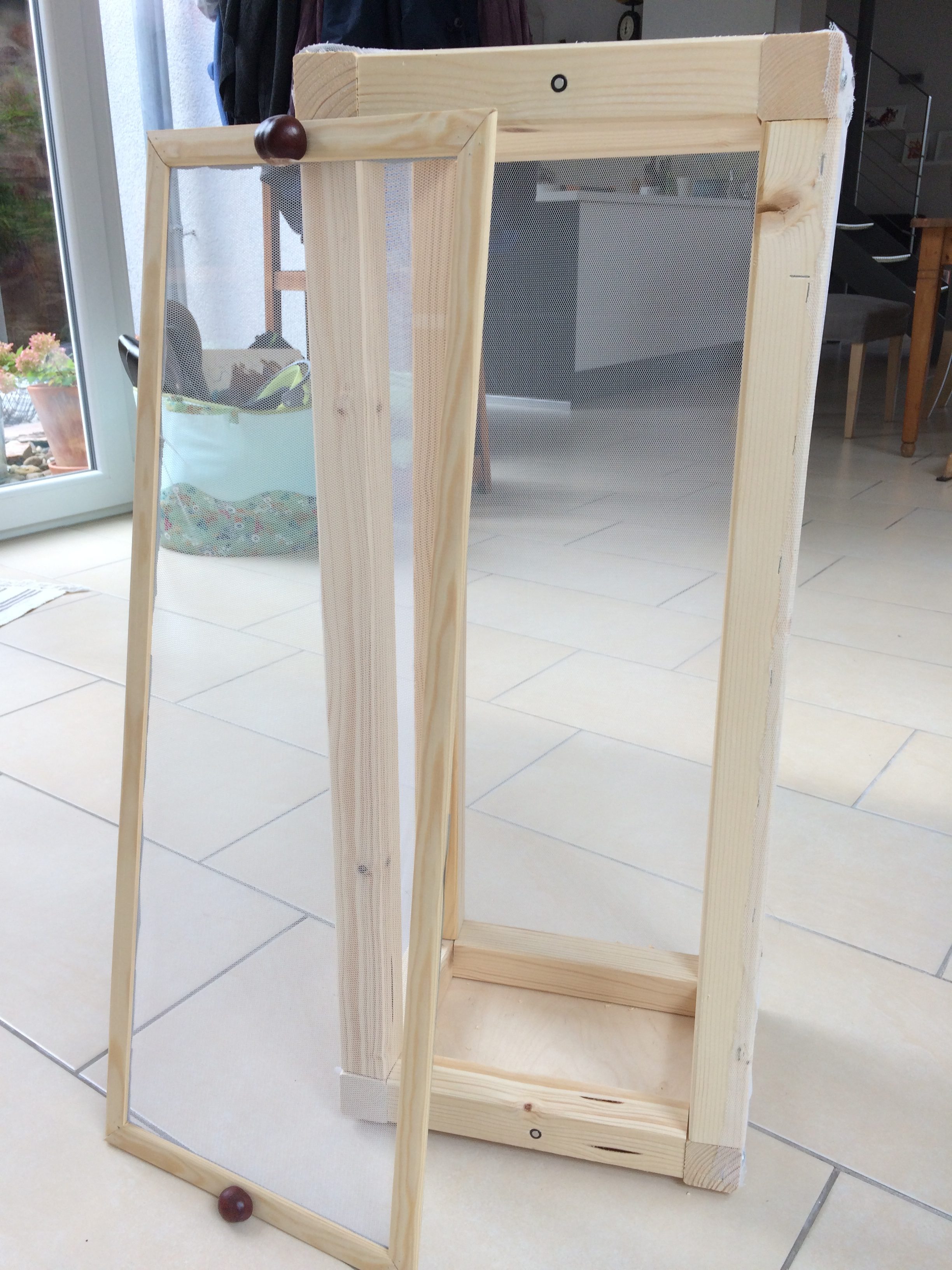 Passender Weise hatten mein Mann und ich Urlaub. Also haben wir uns direkt ans Werk gemacht, und einen Raupenkasten für unseren neuen Freund gebaut. Dazu haben wir aus Kantholz ein Rechteck zusammengeschraubt, dass wir mit Fliegennetz bespannt haben.