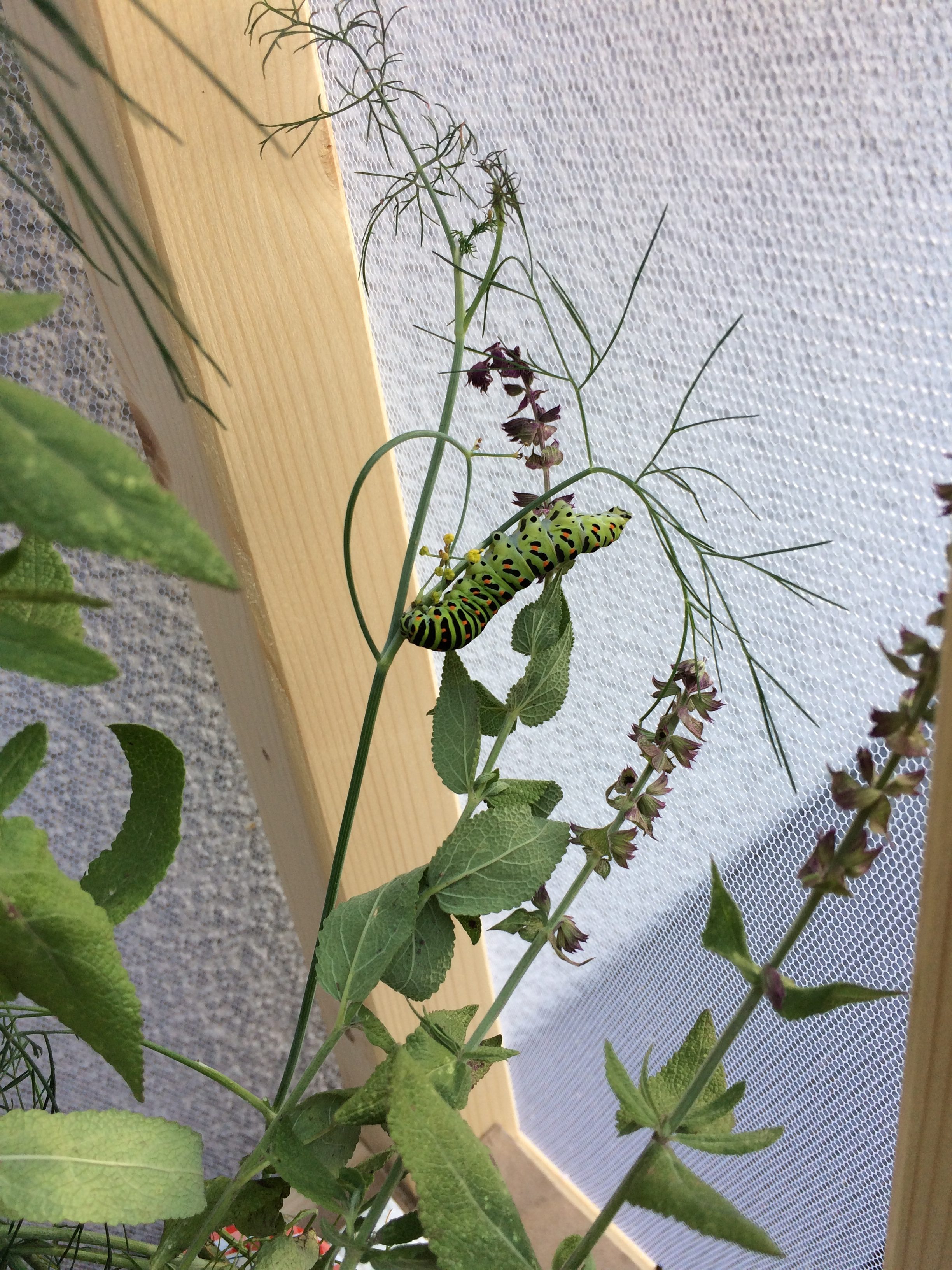 Die Raupe ist zusammen mit Fenchel als Futterpflanze eingezogen und fühlt sich sichtlich wohl – gesagt hat sie das zwar nicht, aber da Fressen und Verdauen super funktionieren, nehmen wir das jetzt mal an.
